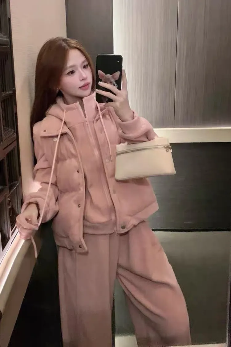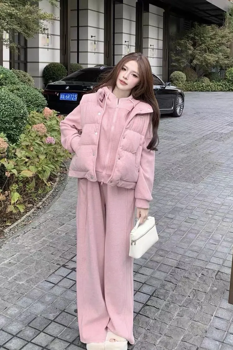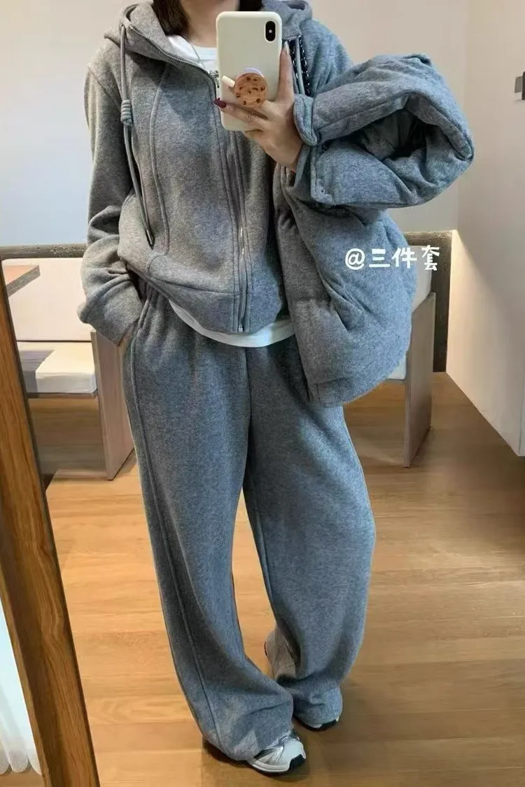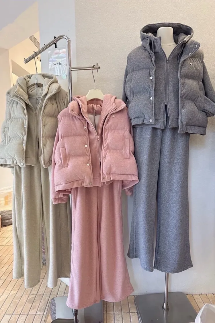 很暖超暖!!三件平均下來單件不用$390分開穿也行雙拉鍊刷絨帽踢(可當外套/上衣)側口袋刷絨寬褲鋪棉澎澎背心背心:胸寬52衣長47上衣:胸寬54 衣長46長褲:腰寬29~52 褲長102顏色:粉 杏 灰