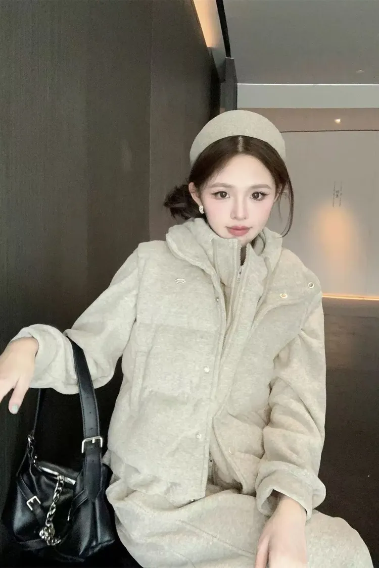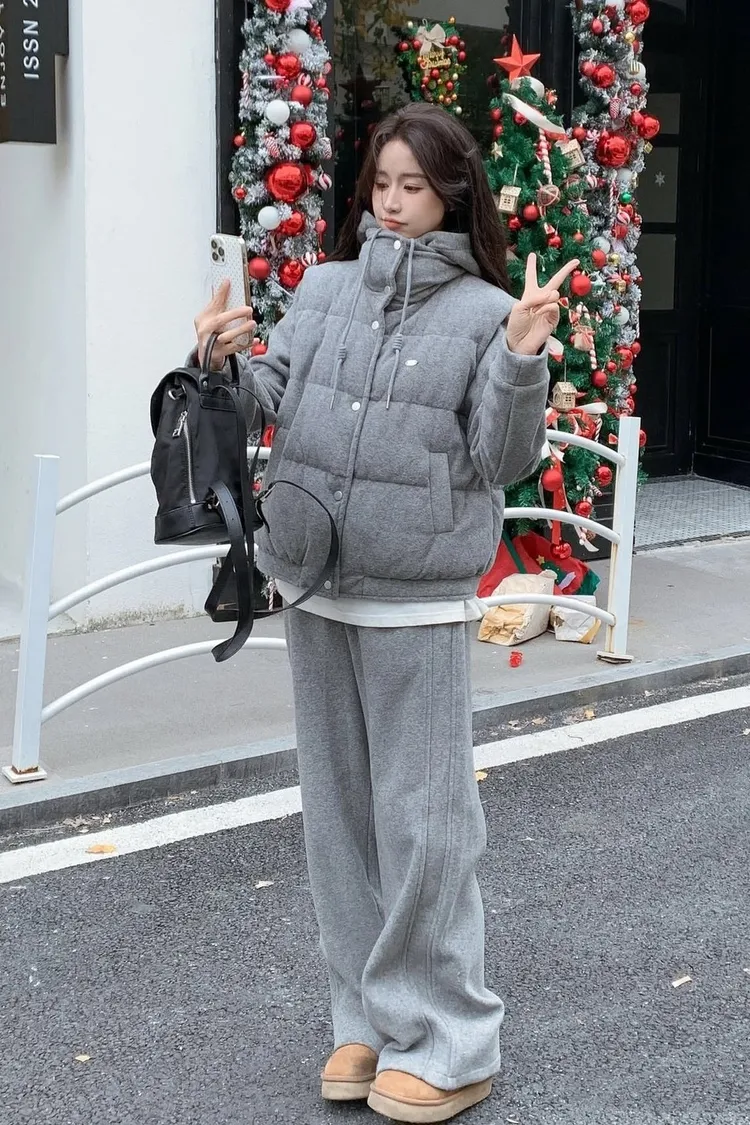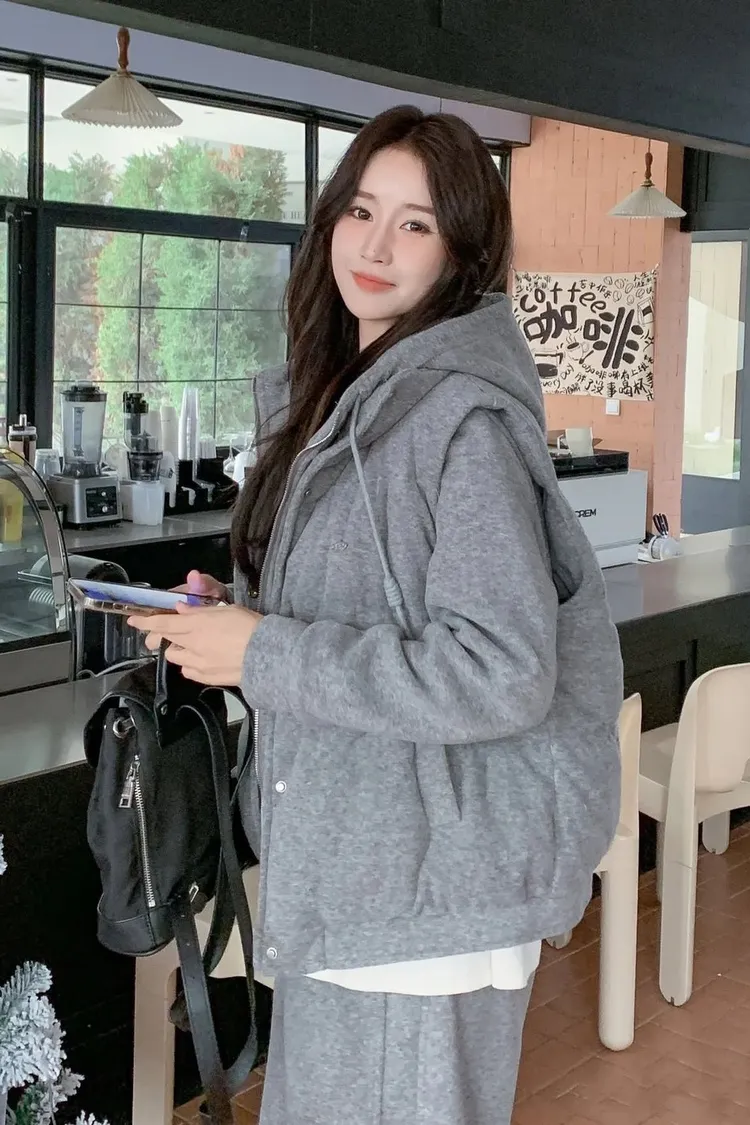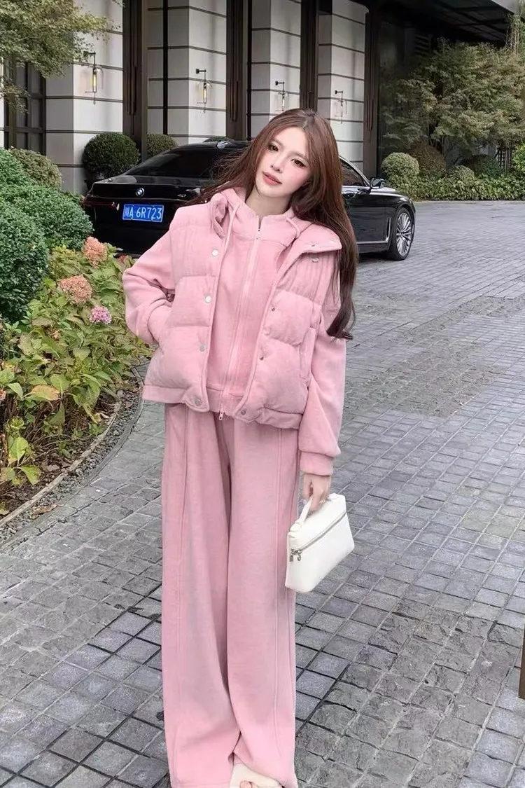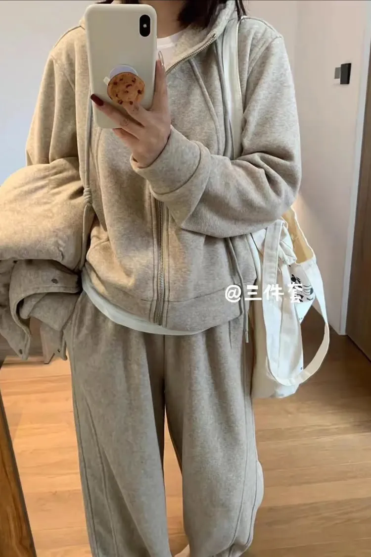 很暖超暖!!三件平均下來單件不用$390分開穿也行雙拉鍊刷絨帽踢(可當外套/上衣)側口袋刷絨寬褲鋪棉澎澎背心背心:胸寬52衣長47上衣:胸寬54 衣長46長褲:腰寬29~52 褲長102顏色:粉 杏 灰