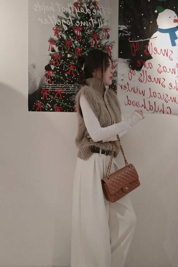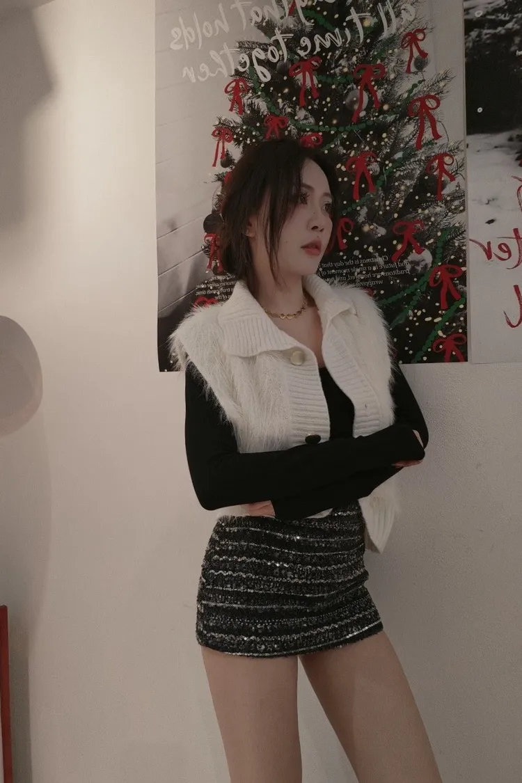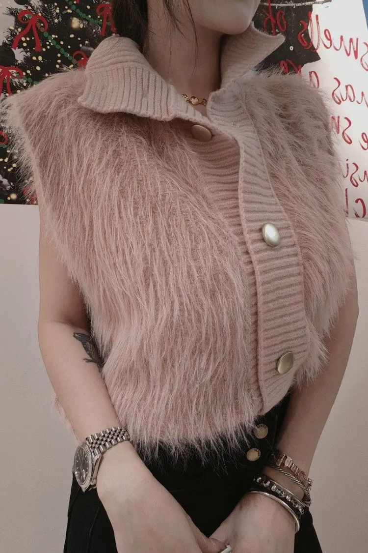 高領金扣毛毛背心