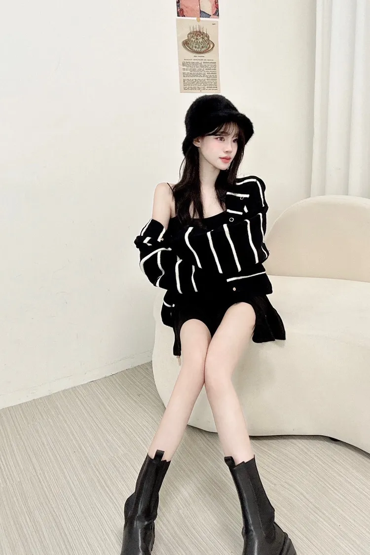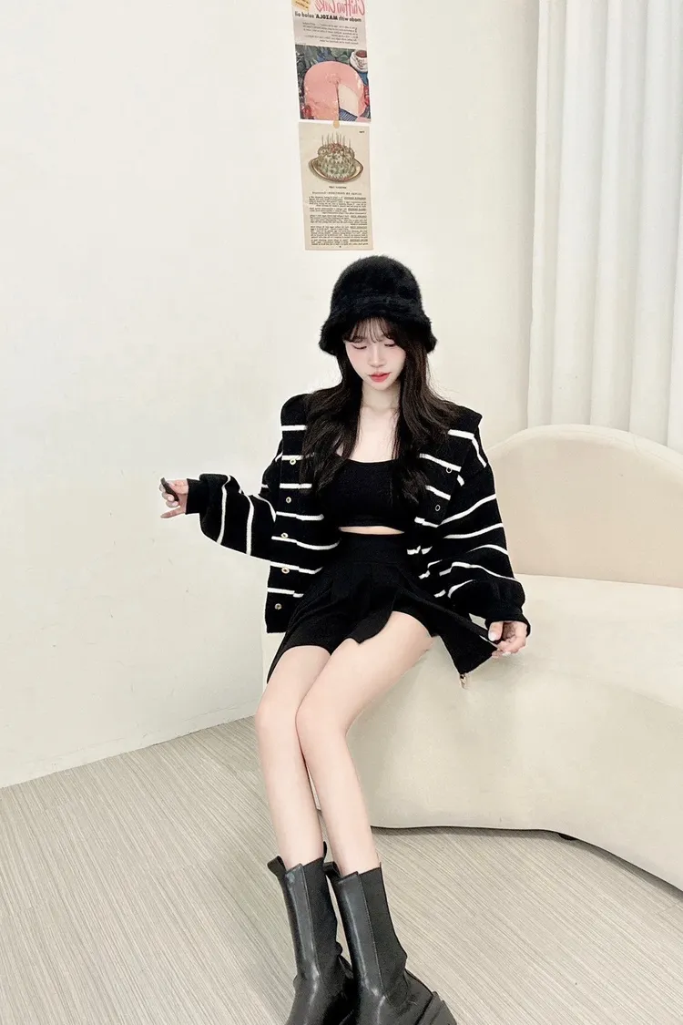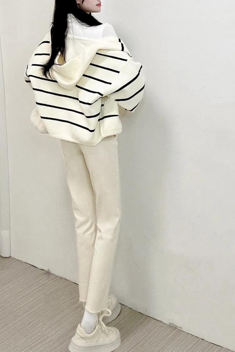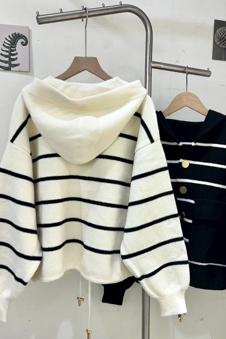針織條紋鈕扣連帽外套