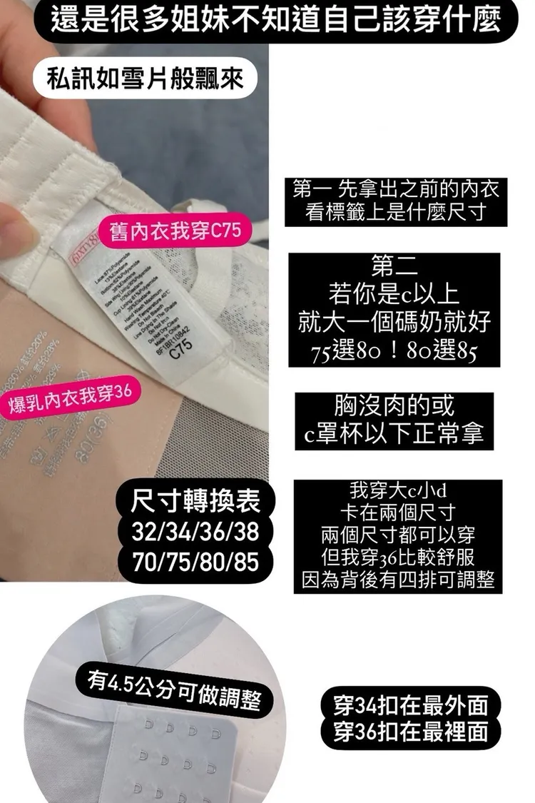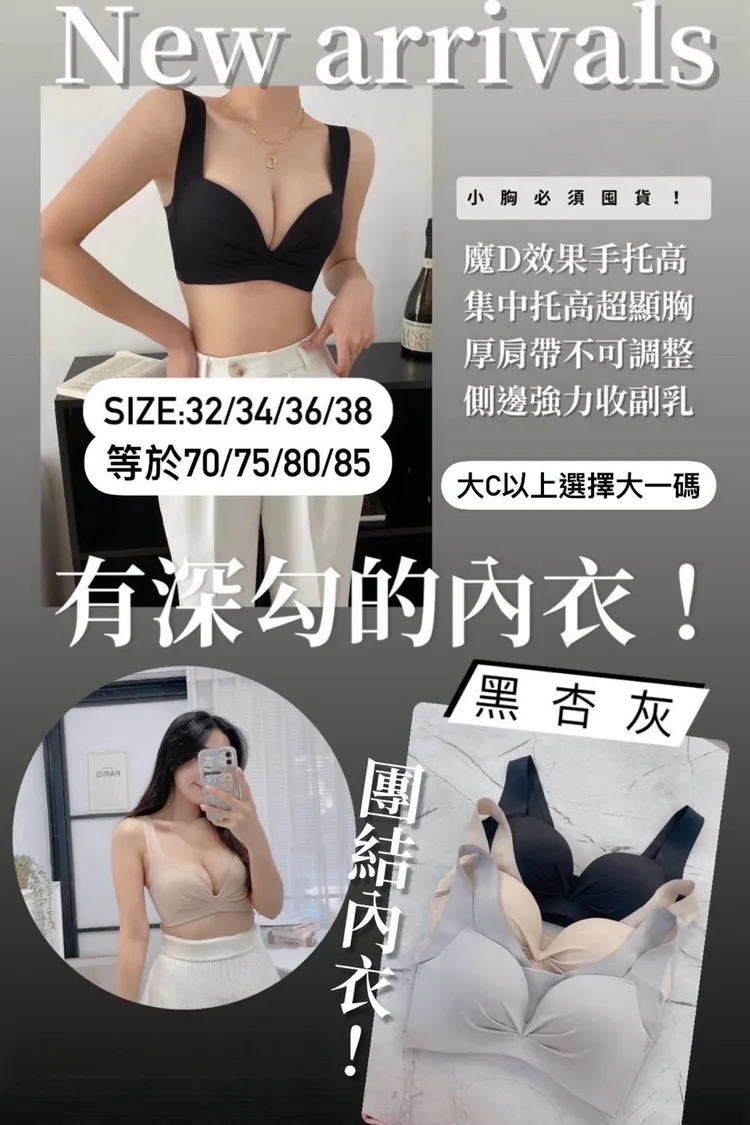 此款大胸部🈲️只能穿到胸圍36E罩杯以上不要買上架前都先請朋友試穿還有自己實測!真的很集中托高!才推薦給大家👍👍👍👍(偏小一碼c罩杯以上要帶大一個尺寸)我平常穿34/75這件穿36/80請確認好尺寸在訂貨唷!無痕寬肩帶 !非常收副乳乳膠墊材質很舒服是屬於下厚上薄的胸墊集中托高的效果很厲害三色都推薦!一定要包色😍顏色:黑/杏/灰尺寸:32/34/36/38等於:70/75/80/85公分量下圍公分計算(後扣有四排可以調整若真的很瘦可以正常拿扣子調整即可)