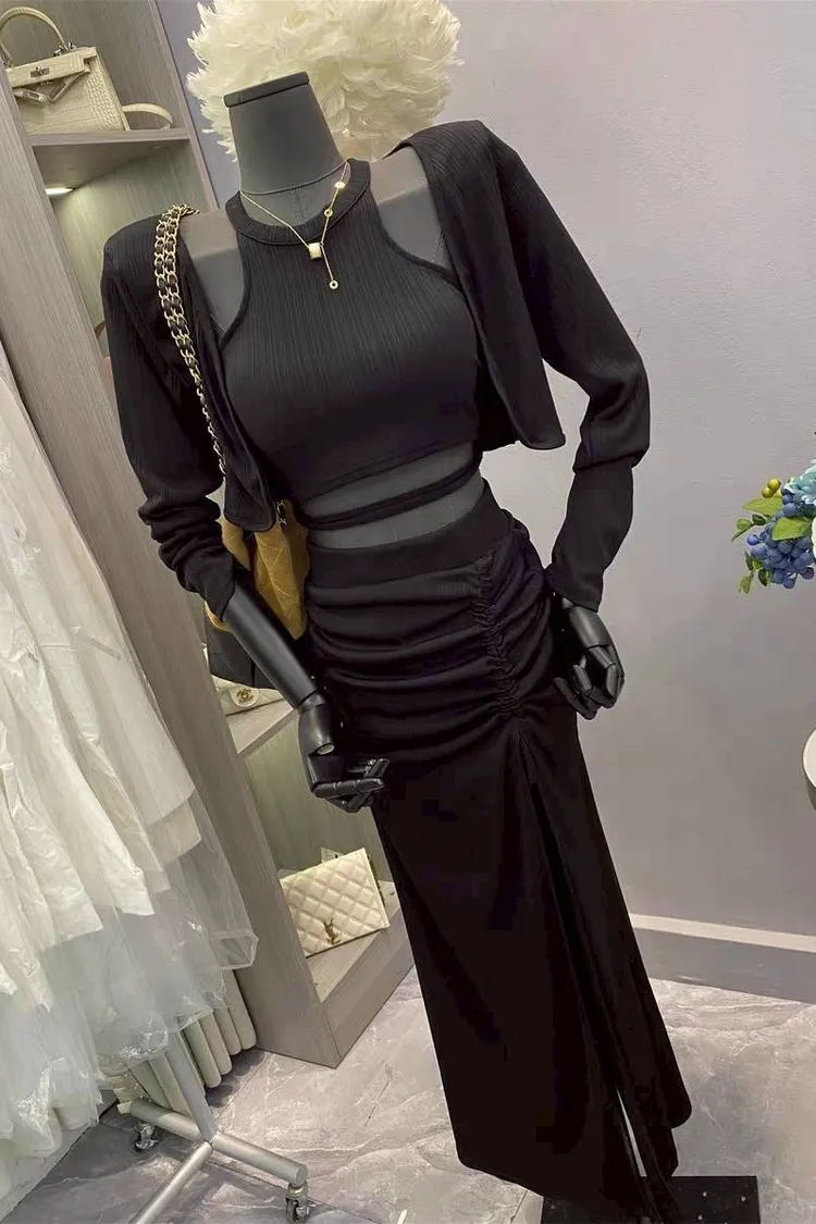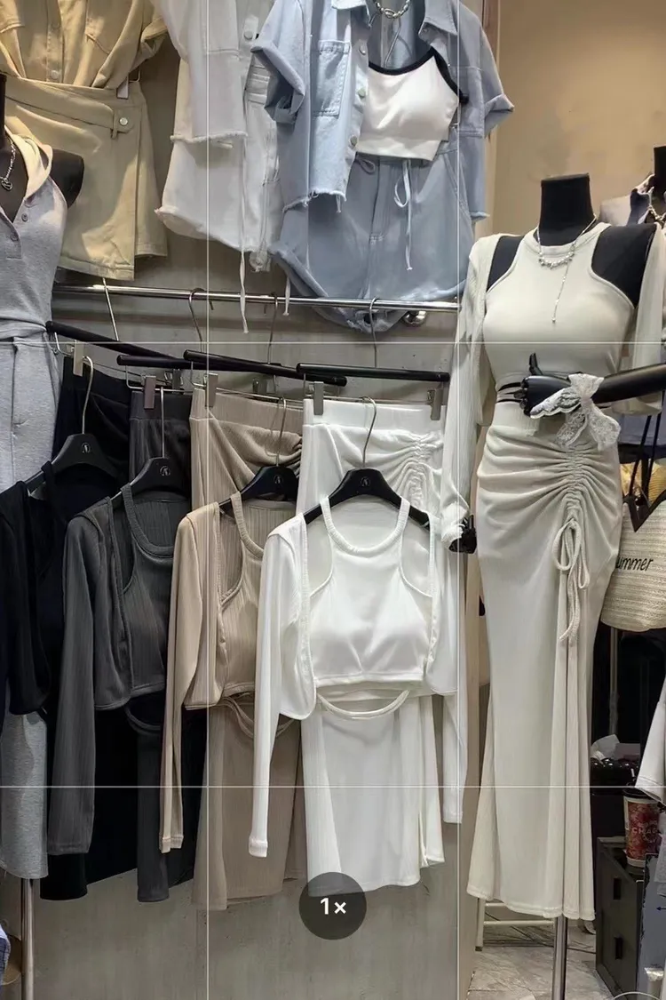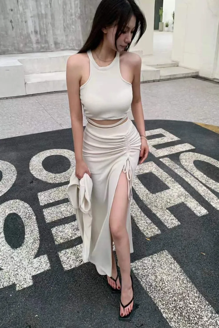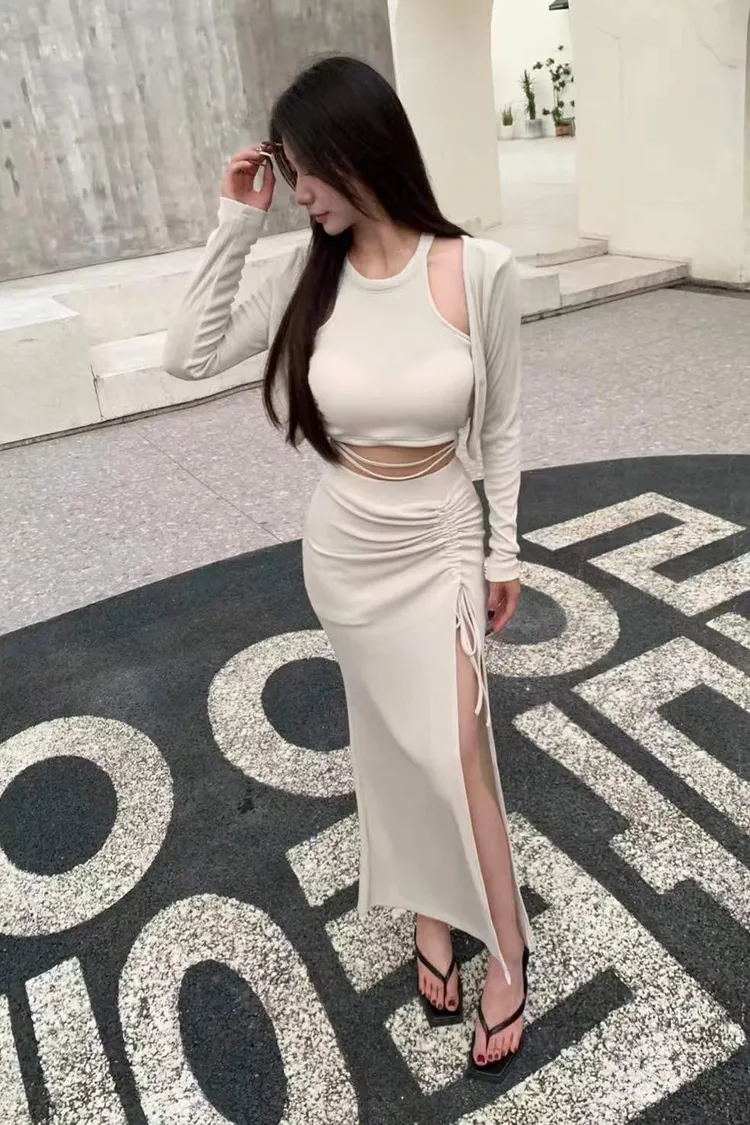 削肩罩杯背心+短版外罩+彈性側抽繩理褲長裙3件set