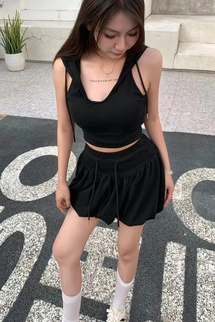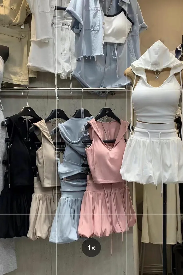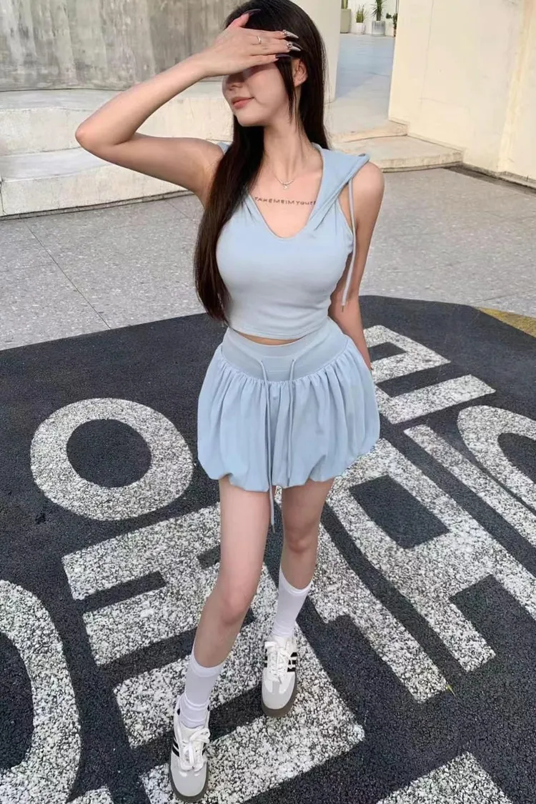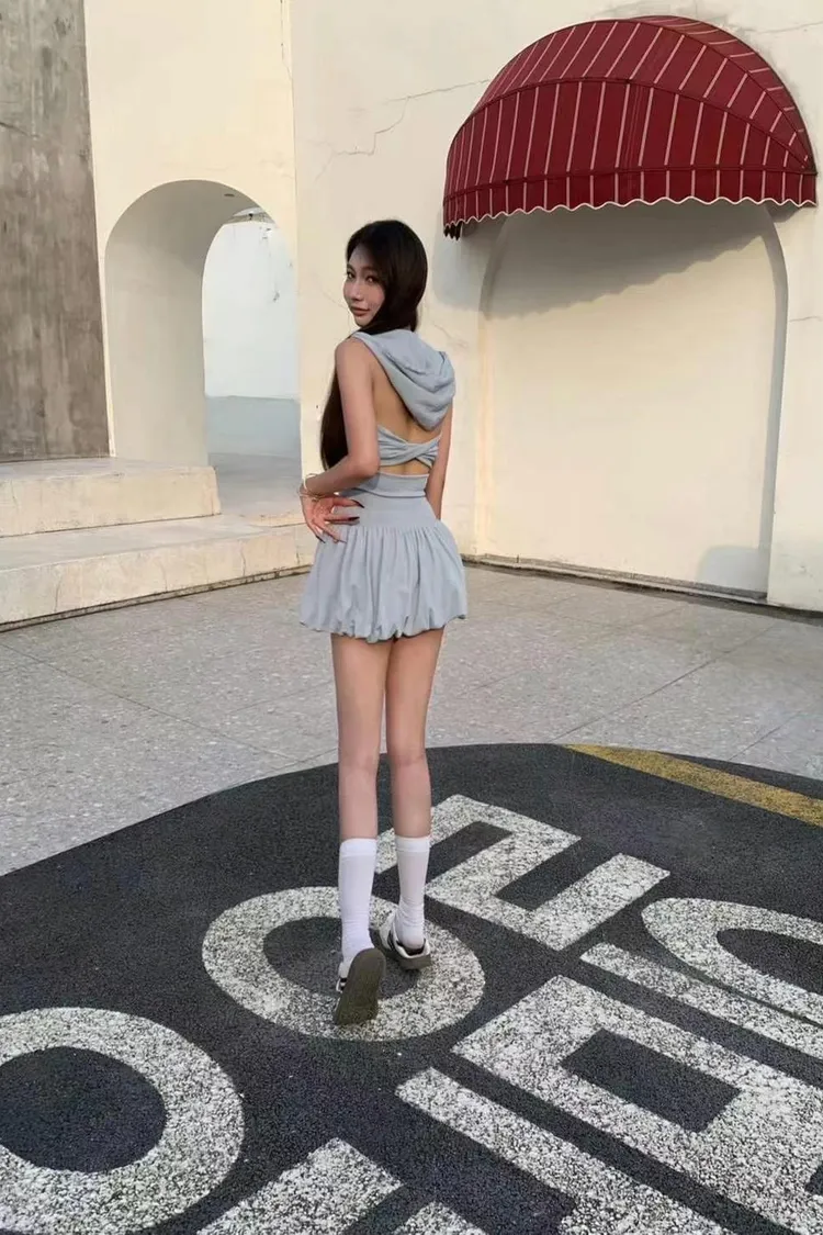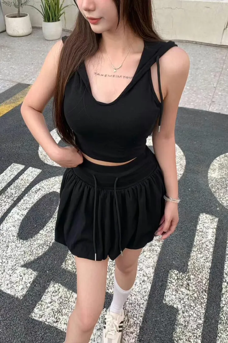 上衣連帽設計潮感滿分 自帶街頭風💯美背交叉綁帶 展現性感線條 小心機超吸睛👀裙擺澎澎超可愛 超級顯腿瘦😙內附胸墊可單穿更方便 穿出自然挺胸線條🤩甜中帶辣 可愛又有態度的連帽套裝不管正面背面都超吸睛💗藍 白 卡 黑 粉