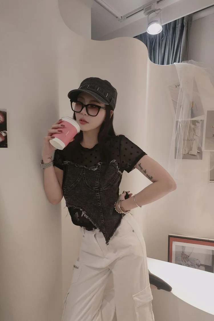率性牛仔接網紗T