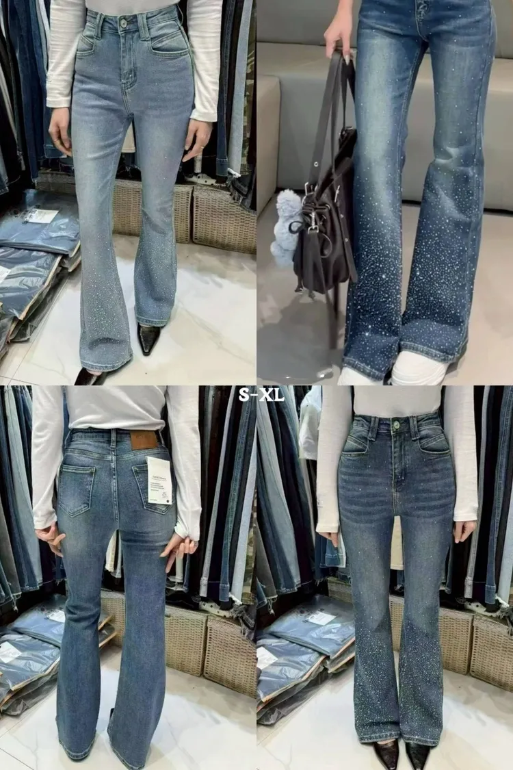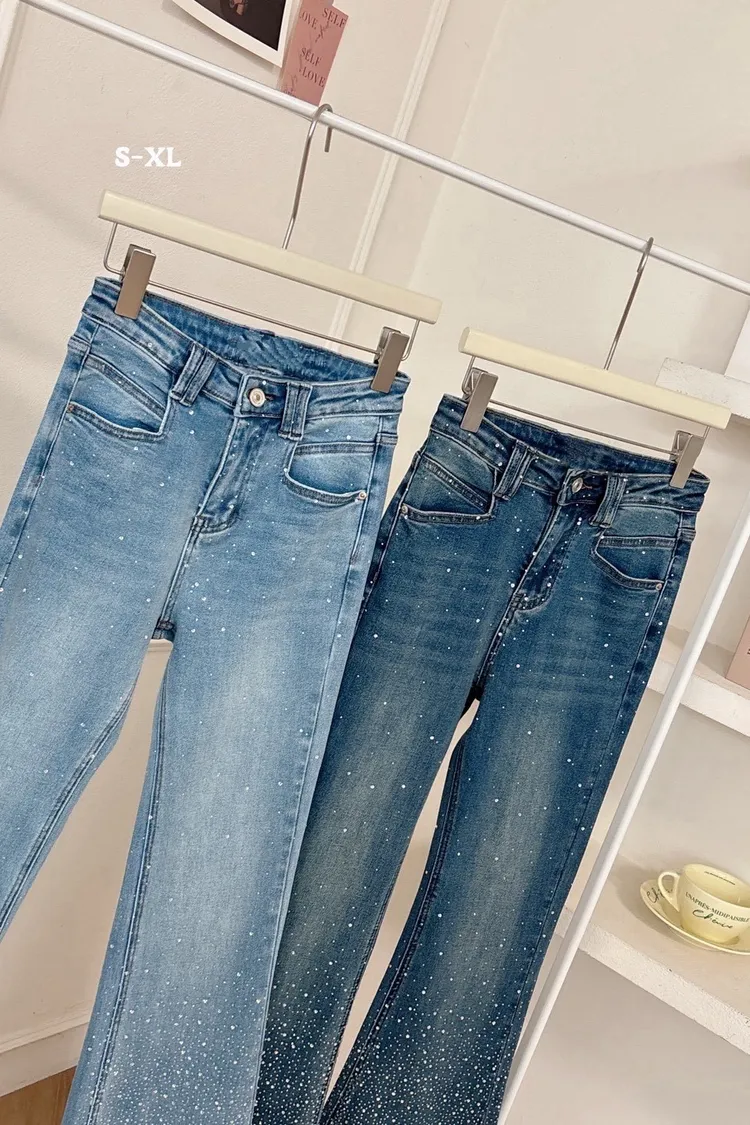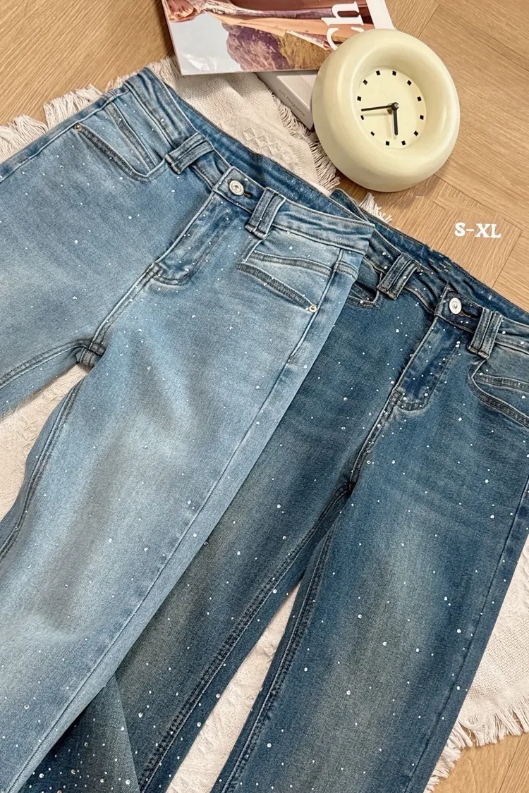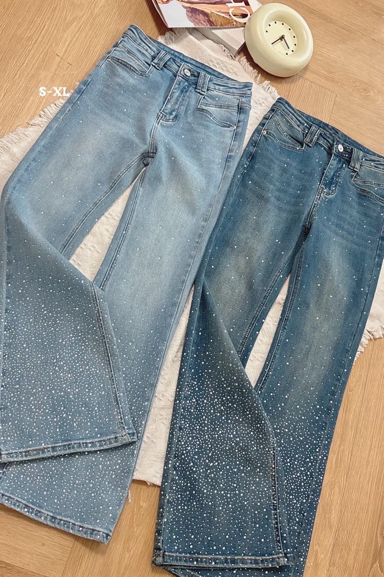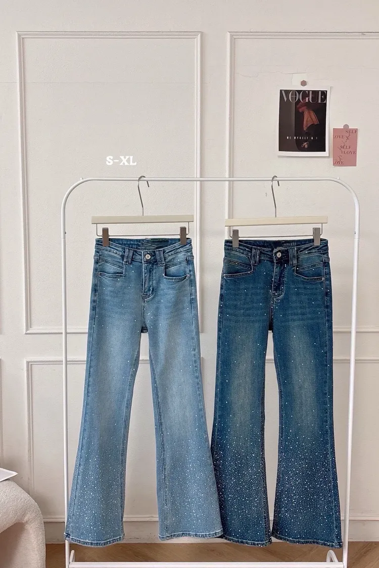✦正常版型 有彈力 S M L XL ✦燙鑽超閃 我看到實體直接發瘋 每走一步就閃一次😍 微喇叭版型更修飾腿型 褲長約103 顏色:深藍 淺藍 $850 兩件包色$1600 平量腰圍S32 M34 L36 XL38