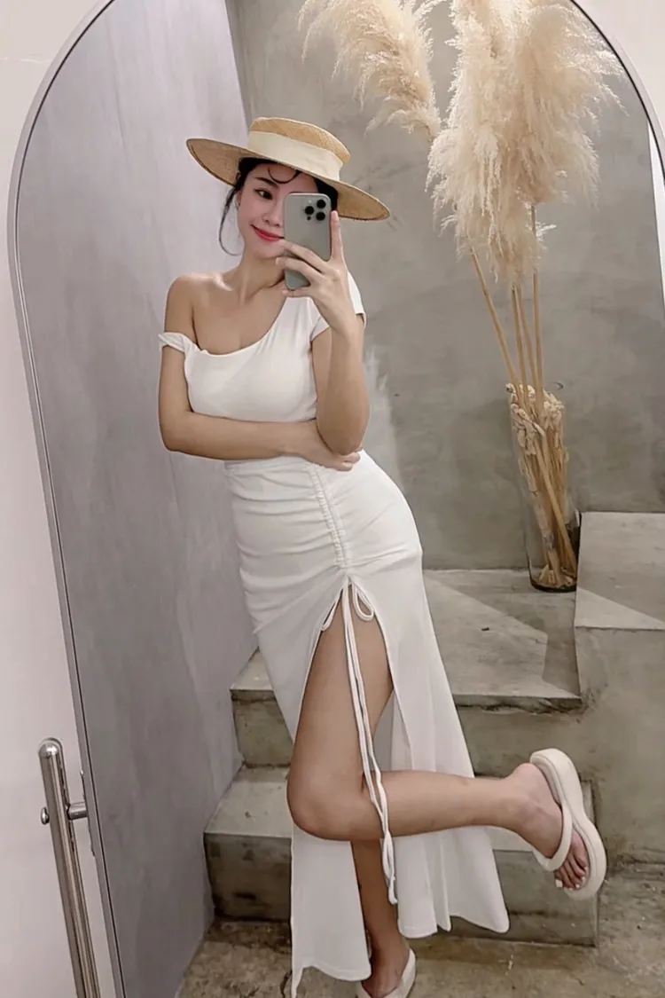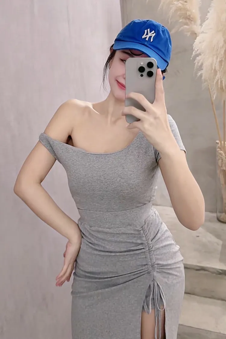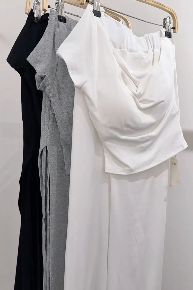 斜肩抽繩套裝