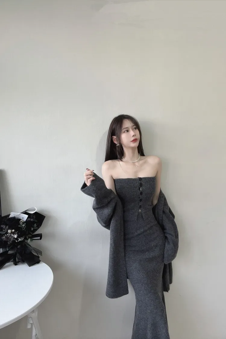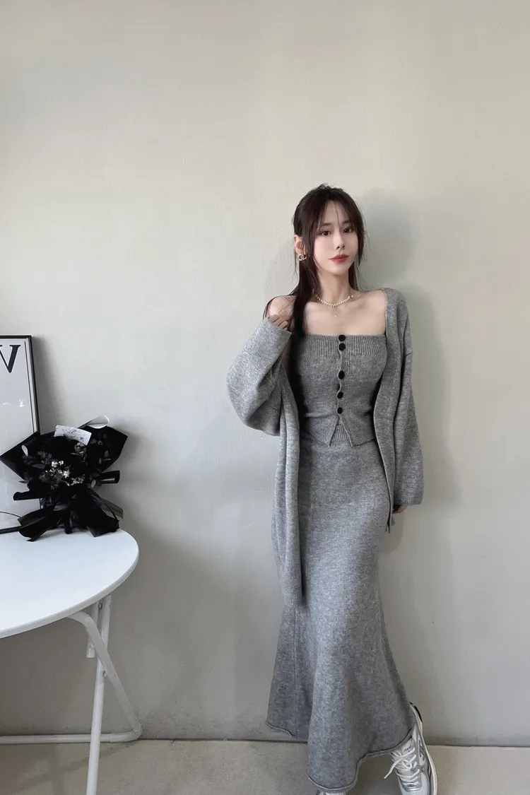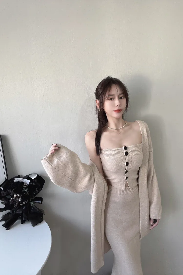 重磅針織🧶親膚不刺有彈性平口排扣下開衩造型搭配針織外套溫柔慵懶,修身效果💯不挑人絕對都可輕鬆駕馭整套搭好一秒出門不廢腦🕶️分開穿搭也都是很必收的單品!背心胸寬 28公分腰寬 31公分衣長 28公分魚尾裙腰寬 32公分臀寬 39公分裙長 95公分外套肩寬 59公分胸寬 69公分腰寬 64公分袖長 46公分衣長 81公分