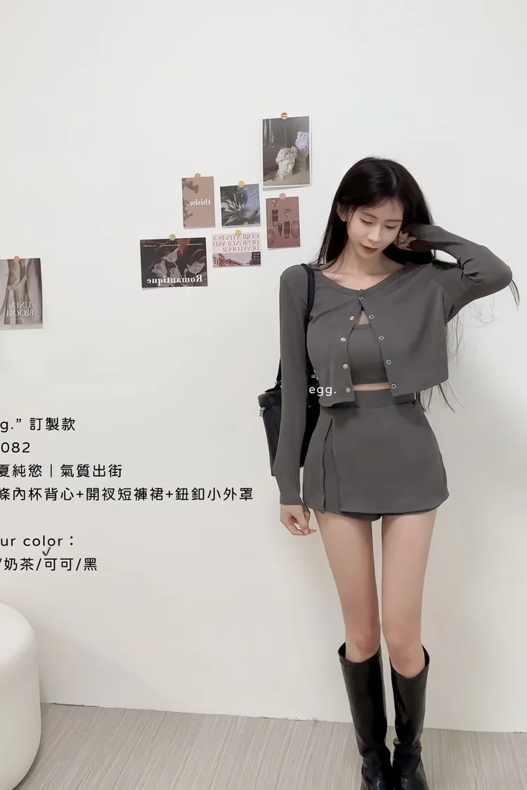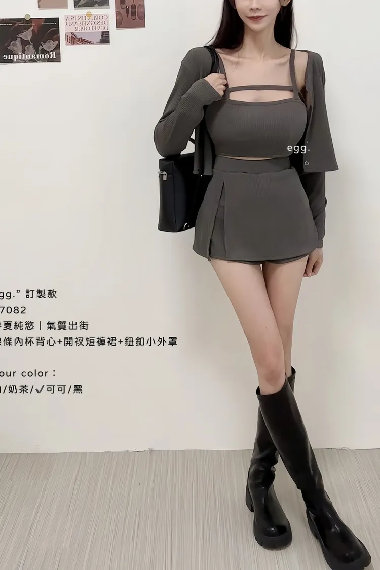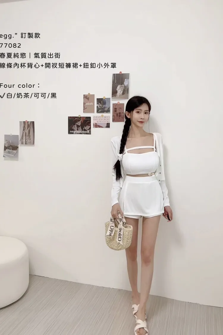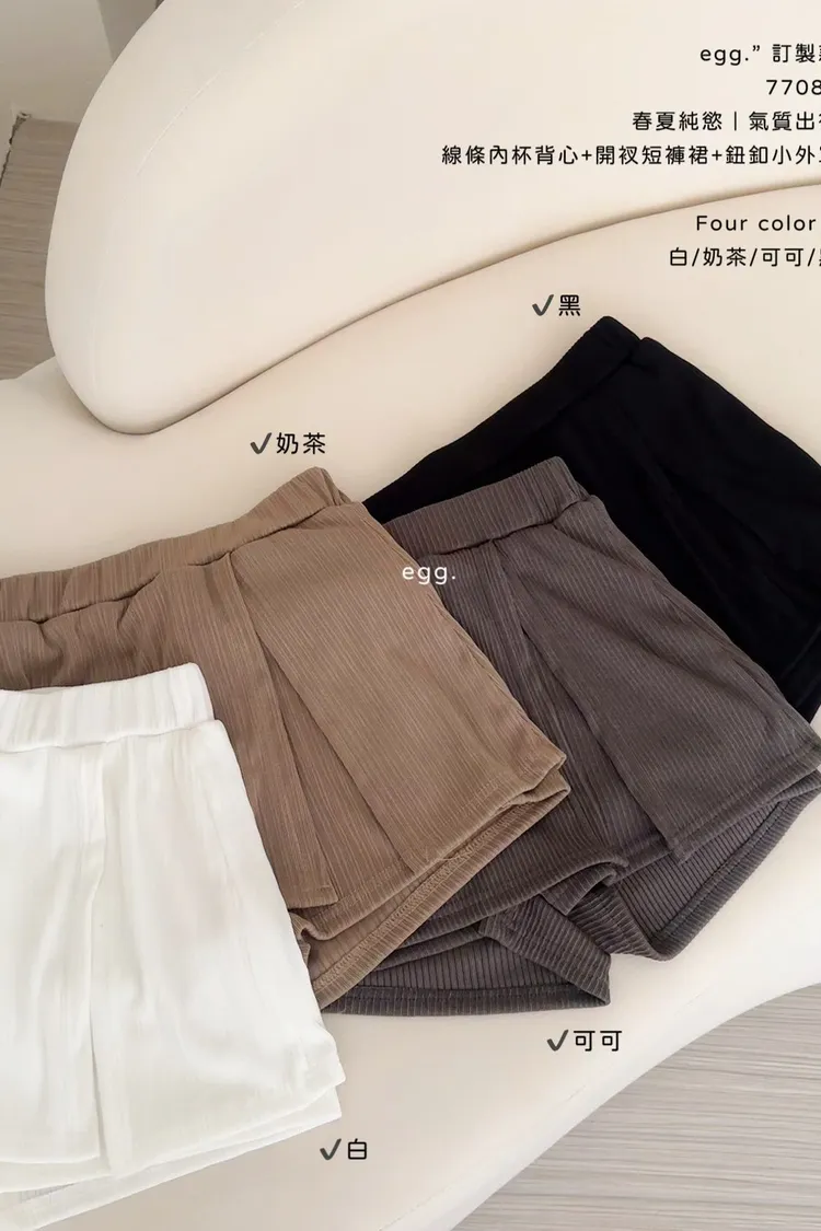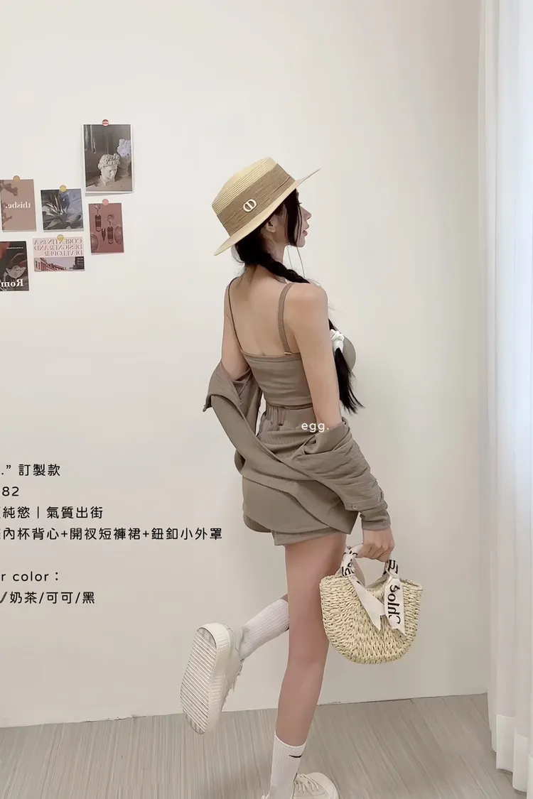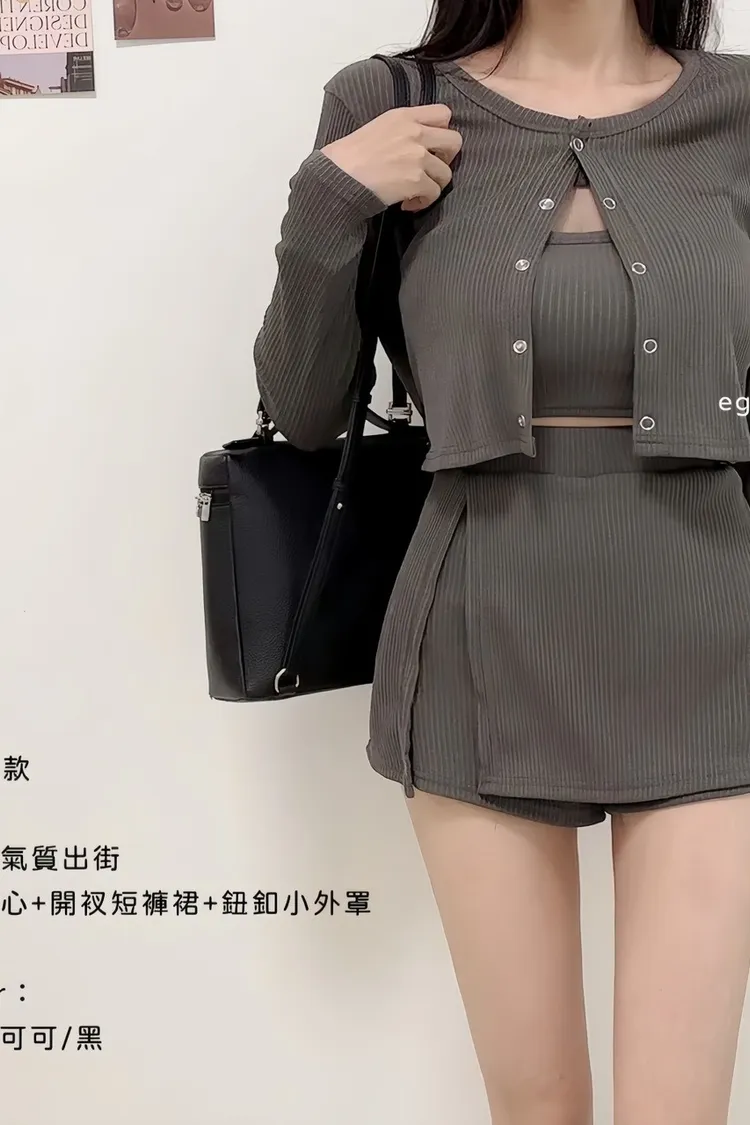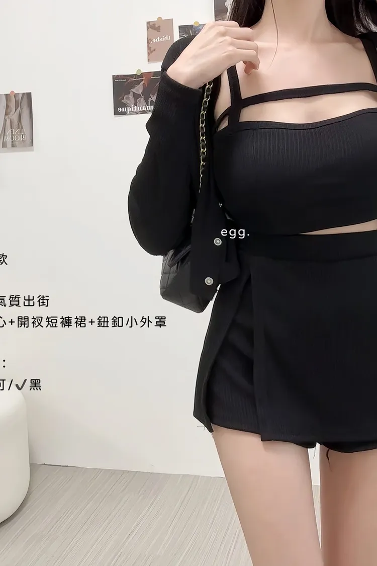 線條內杯背心+開衩短褲裙+鈕釦小外罩