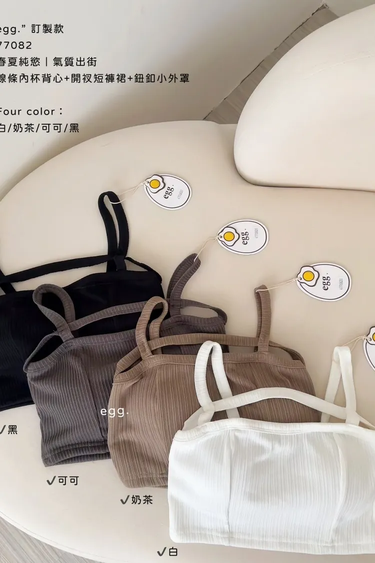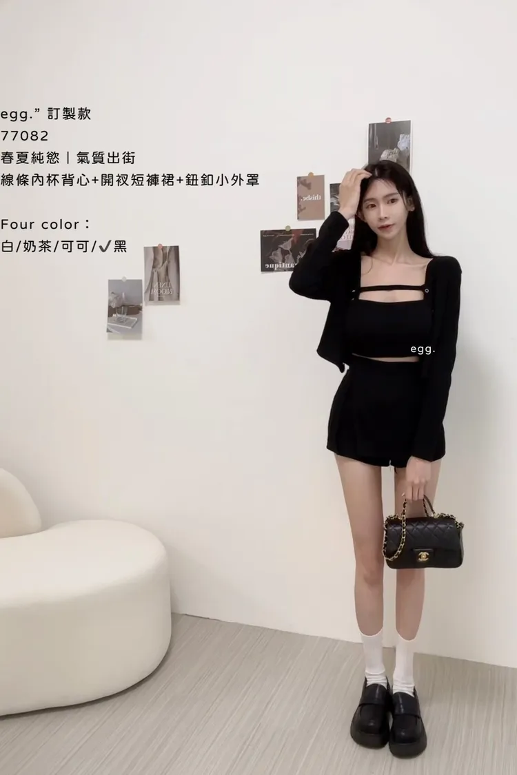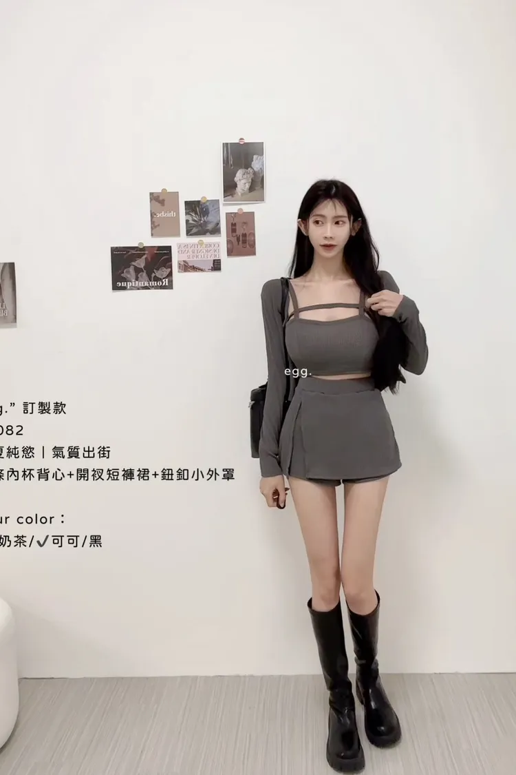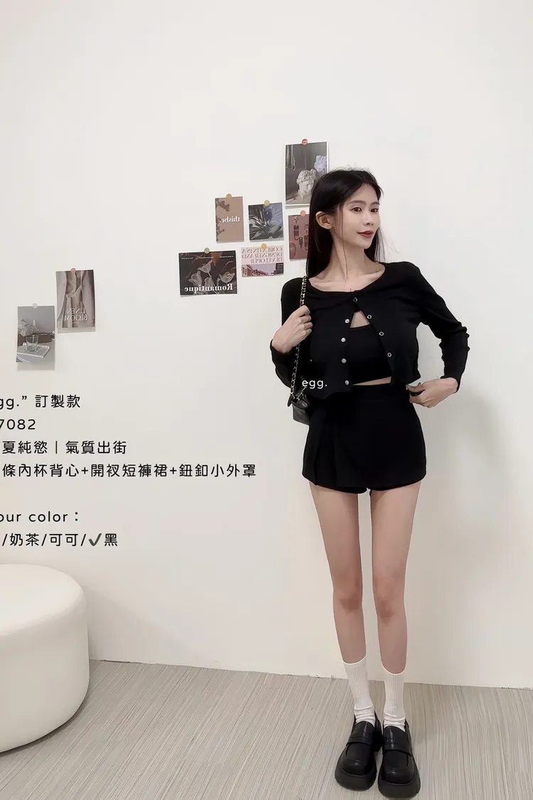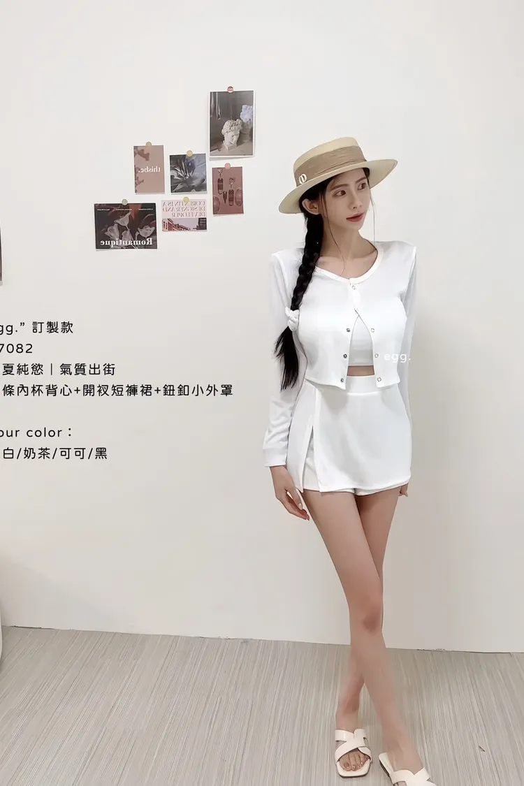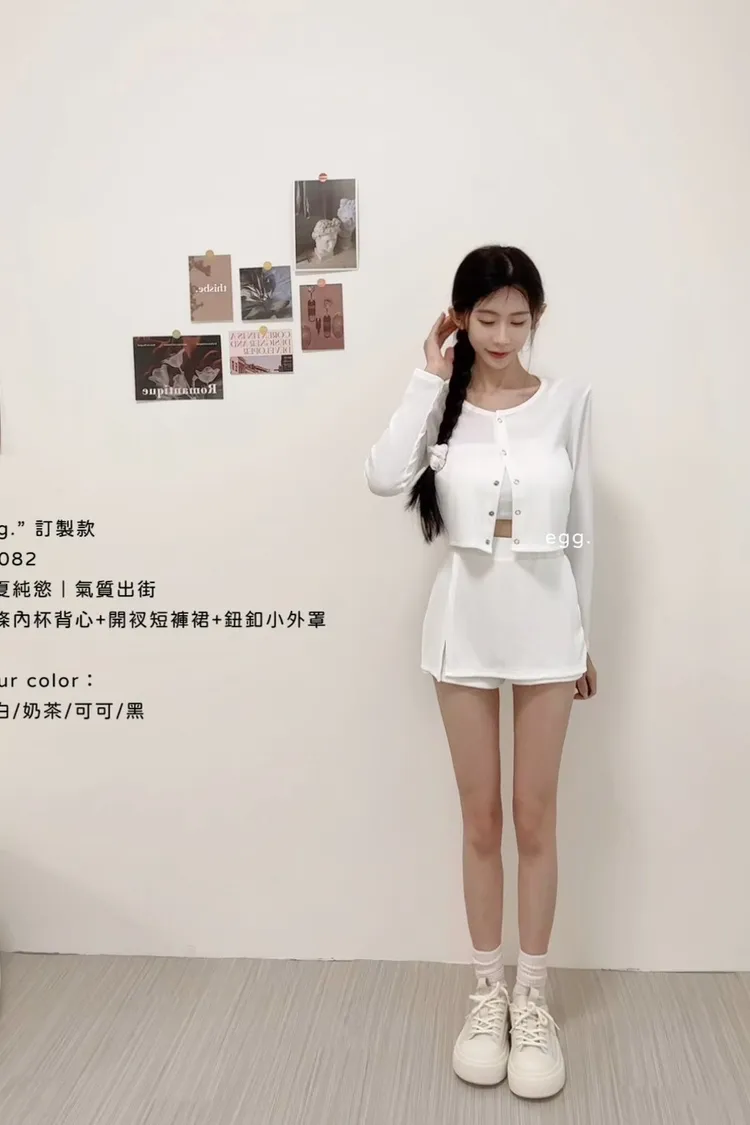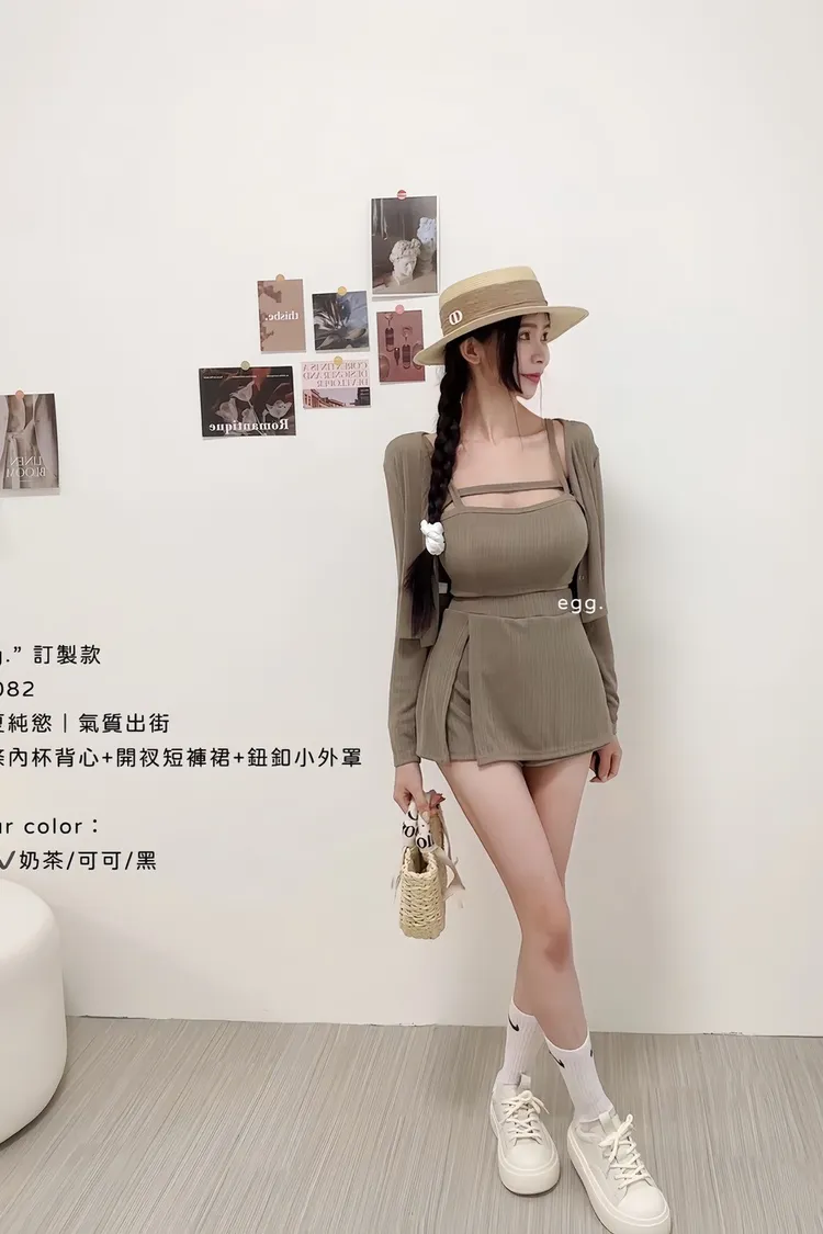 線條內杯背心+開衩短褲裙+鈕釦小外罩