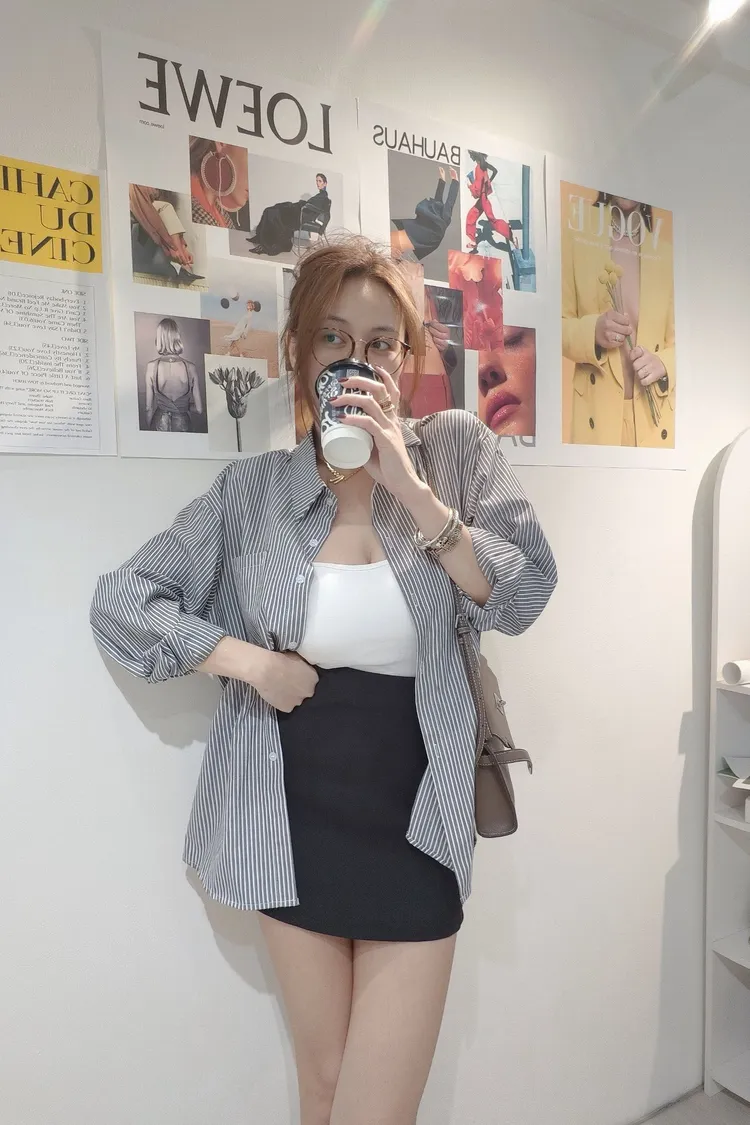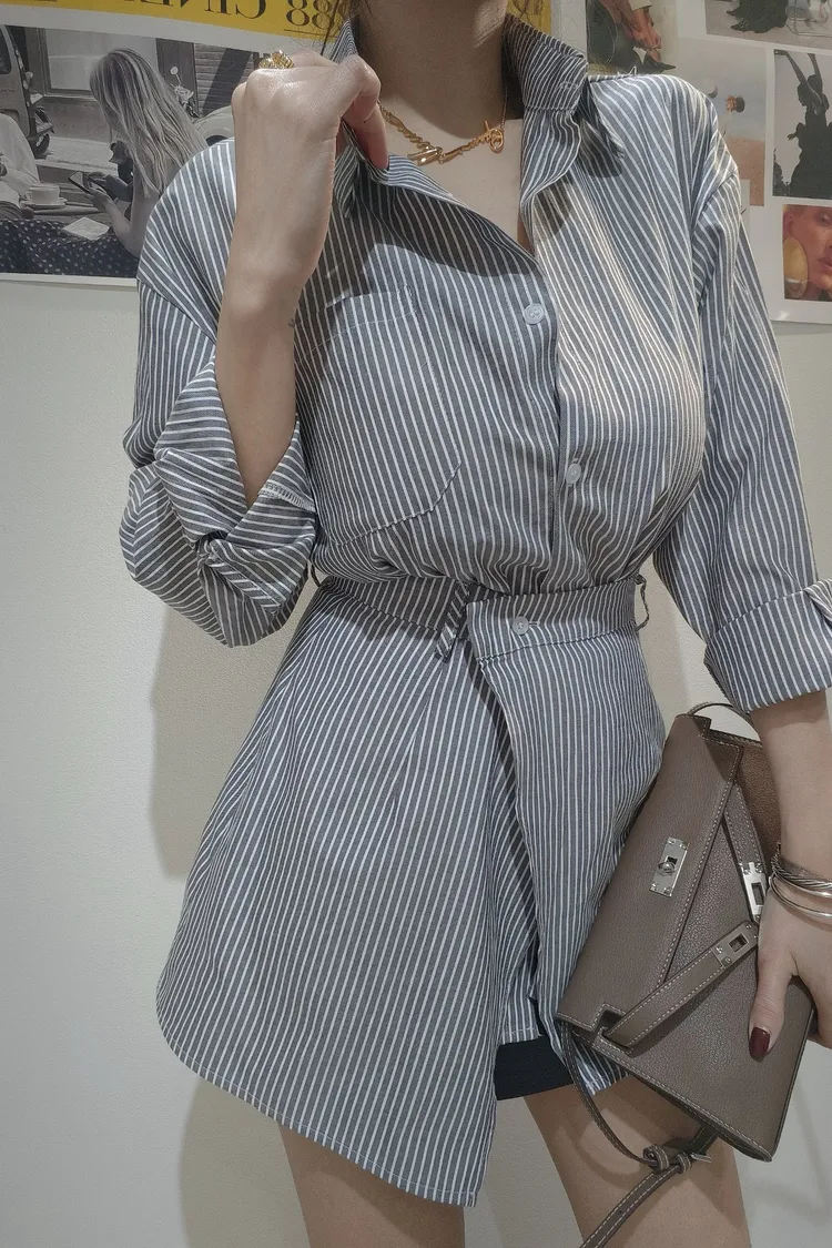 專屬左家的高定款♥日常防曬襯穿、正式場合穿一件多用!!格雷灰底結合白條 顯瘦足夠自行搭配喜愛的腰帶⚠️片裙三顆扣 (𝘚~𝘓都能駕馭)⚠️襯衫寬版65kg可以穿
