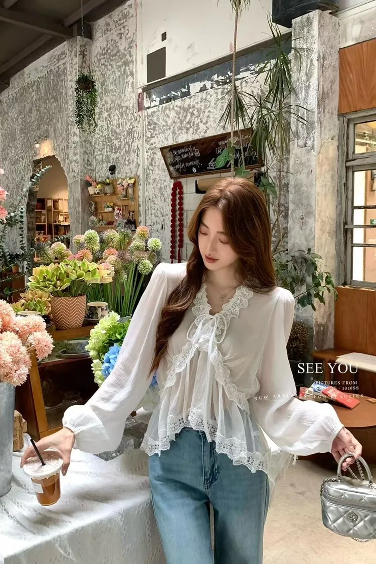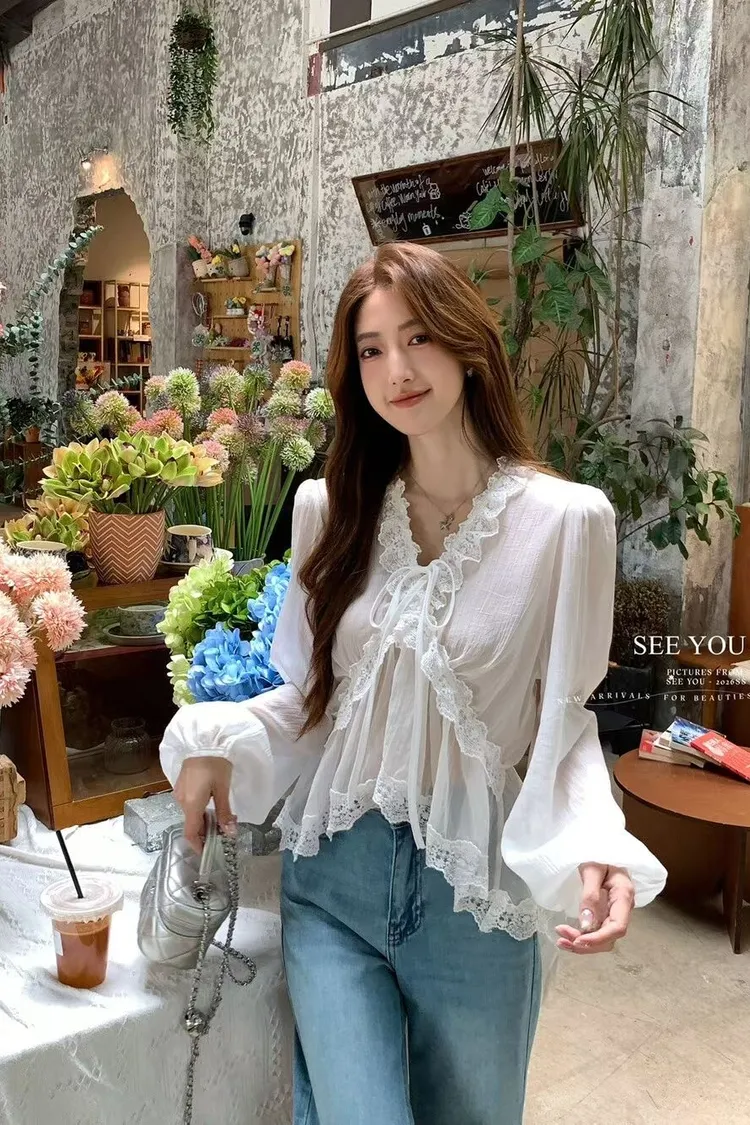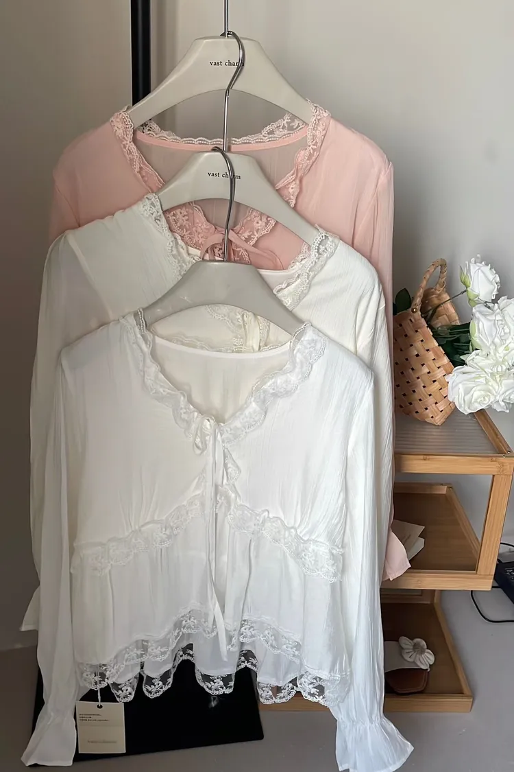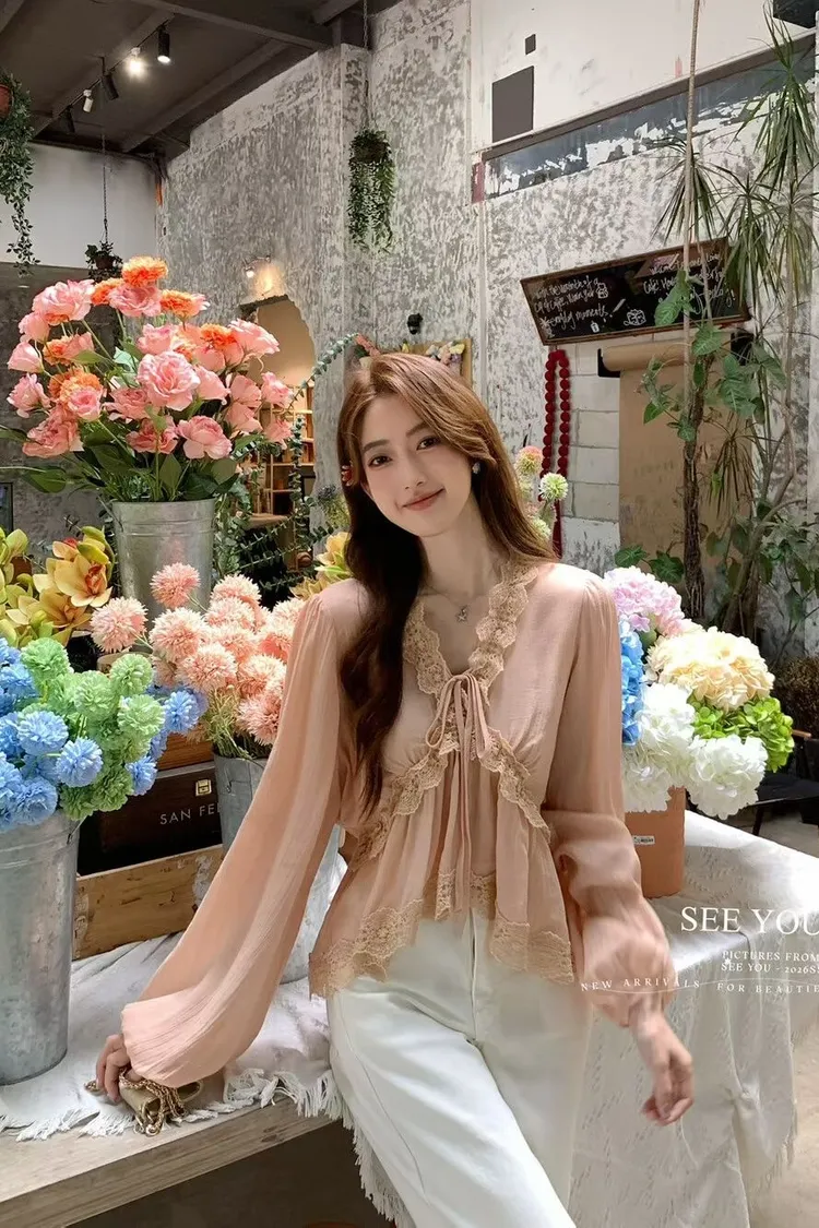 蕾絲雪紡綁繩上衣