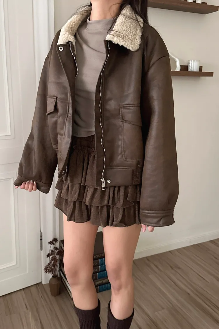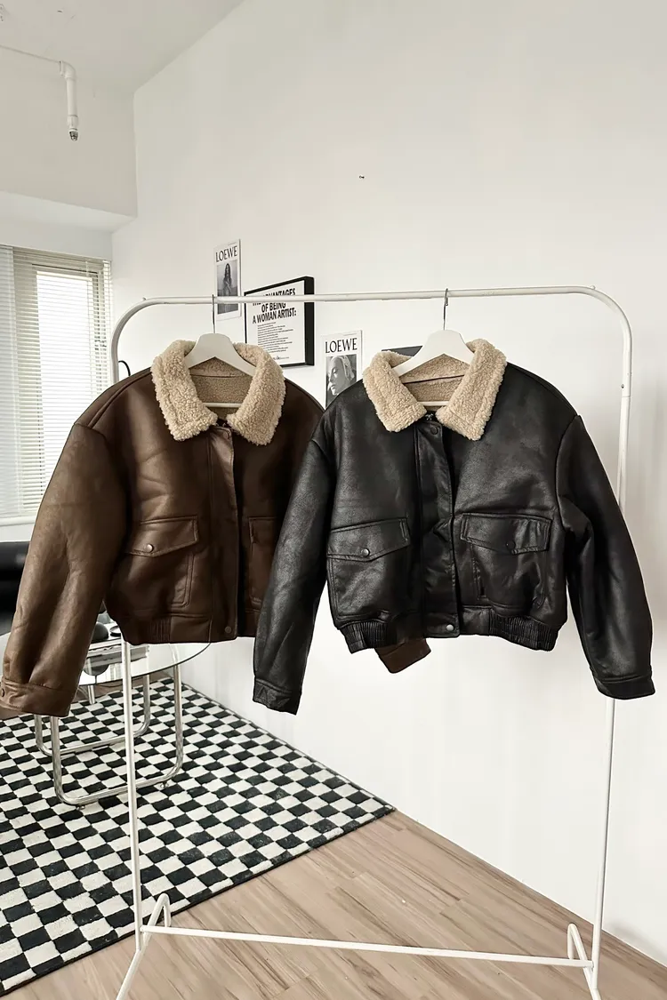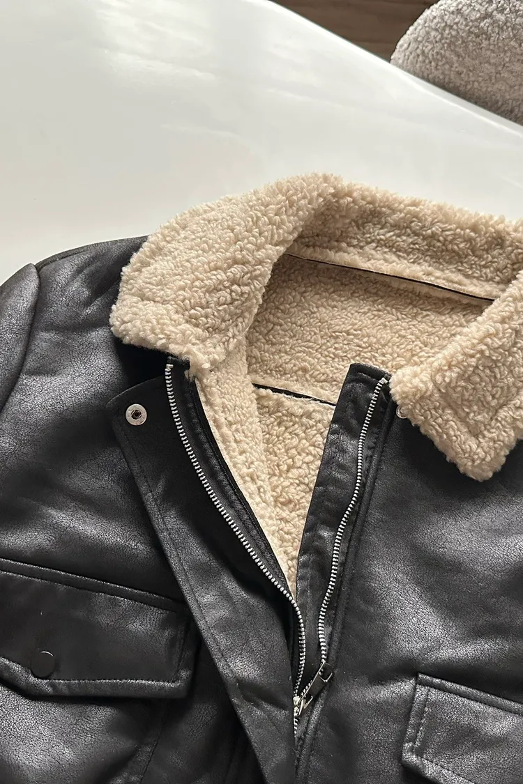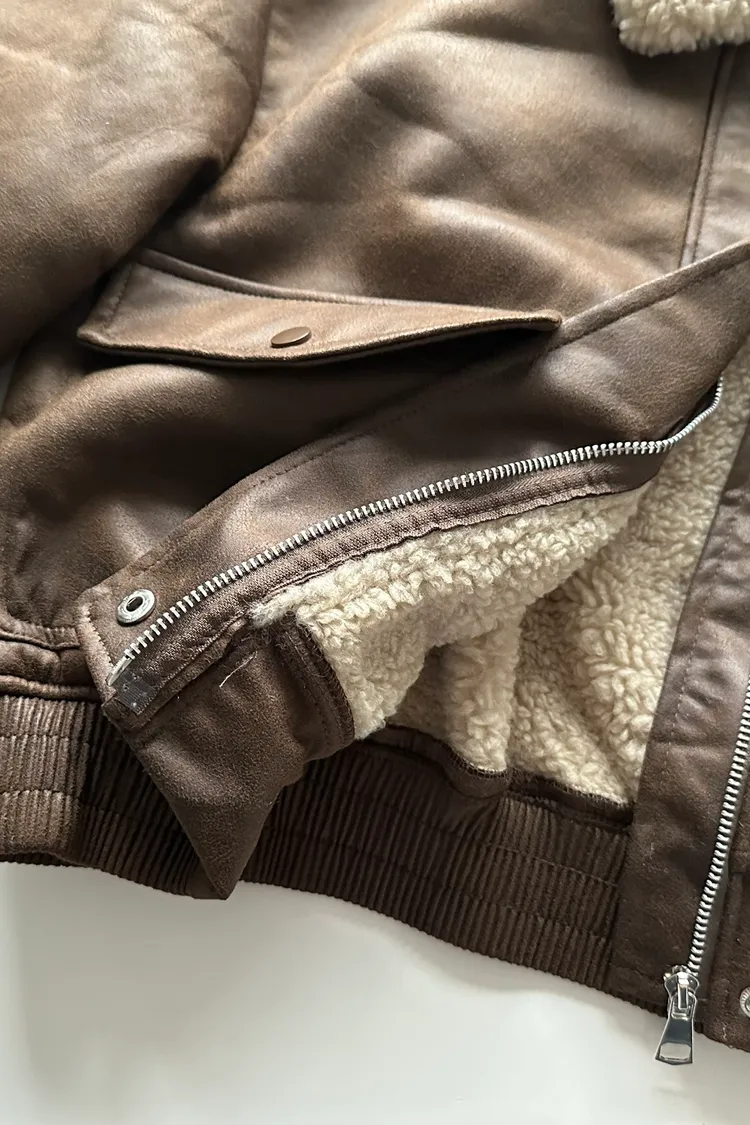 羊羔毛領裂紋皮外套