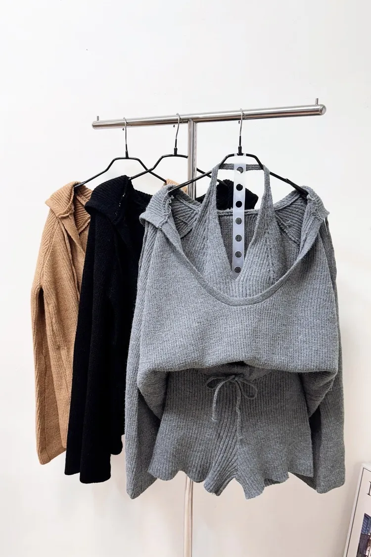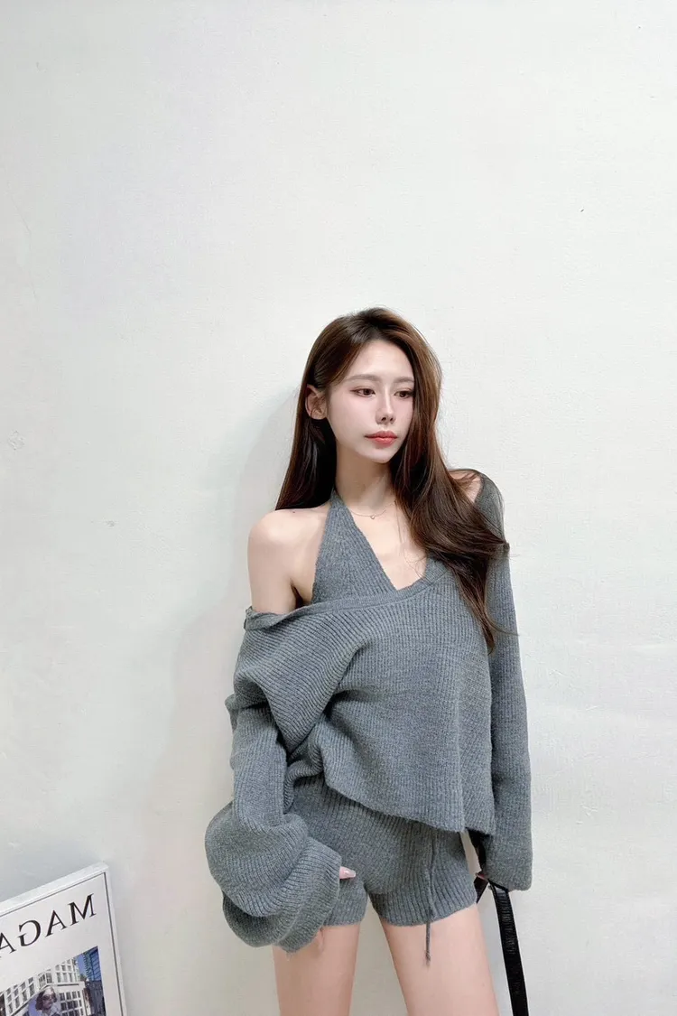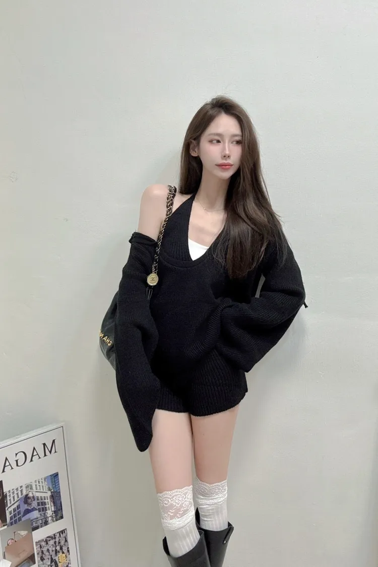 可以穿到XL 無罩杯 「氛圍感拉滿的三件式套裝,一次擁有露肩與層次的多變穿法。」 掛脖背心勾勒精緻鎖骨 搭配寬鬆大袖擺外罩 穿出隨性不羈的時髦。 厚實軟綿針織面料保暖又親膚 顏色:黑 / 灰 / 卡 ➤ 小提醒:三件組可拆開自由搭配,針織材質建議洗滌時放入洗衣袋,避免拉扯造成掛脖處變形。